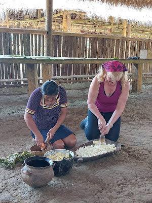 Viereisessä kuvassa ollaankin Amazonin sademetsän keskellä ja pääsin kylän kätilön Awanan oppiin valmistamaan maniokkimuusia.